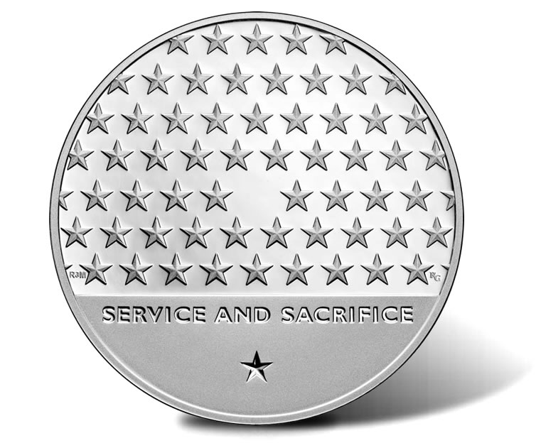 Designed by Richard Masters and sculpted by Renata Gordon, the medal’s reverse shows a field of stars symbolizing past, present, and future American veterans.