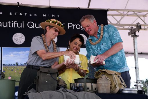 The 25-cent piece also started entering circulation today. In a bit of a twist, the official War in the Pacific quarter release ceremony was held almost a month ago. Typically, launch ceremonies have followed a quarter’s release into circulation.