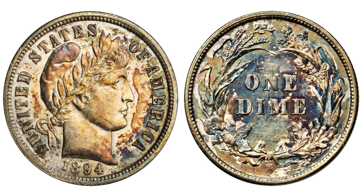 Although 10 pairs of dies for coining dimes were sent from Philadelphia to the San Francisco Mint, the only production was a run of 24 coins on June 9, 1894, using just one die pair. Coins struck from these were prooflike in appearance, but were not mirror Proofs in the style that would have been made for the numismatic trade. Nevertheless, in later years collectors and dealers often described them as such.