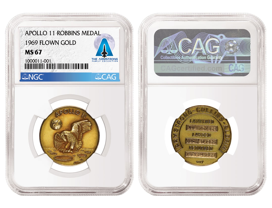 Only three Robbins Medals were struck in gold for Apollo 11, one for each astronaut. The example from the Armstrong Family Collection is graded MS 67 by Numismatic Guaranty Corporation® (NGC), a CAG affiliate, certified by CAG, and encapsulated in a secure CAG holder designed for long-term preservation. The NGC MS 67 grade is near the top of an internationally recognized 70-point grading scale.