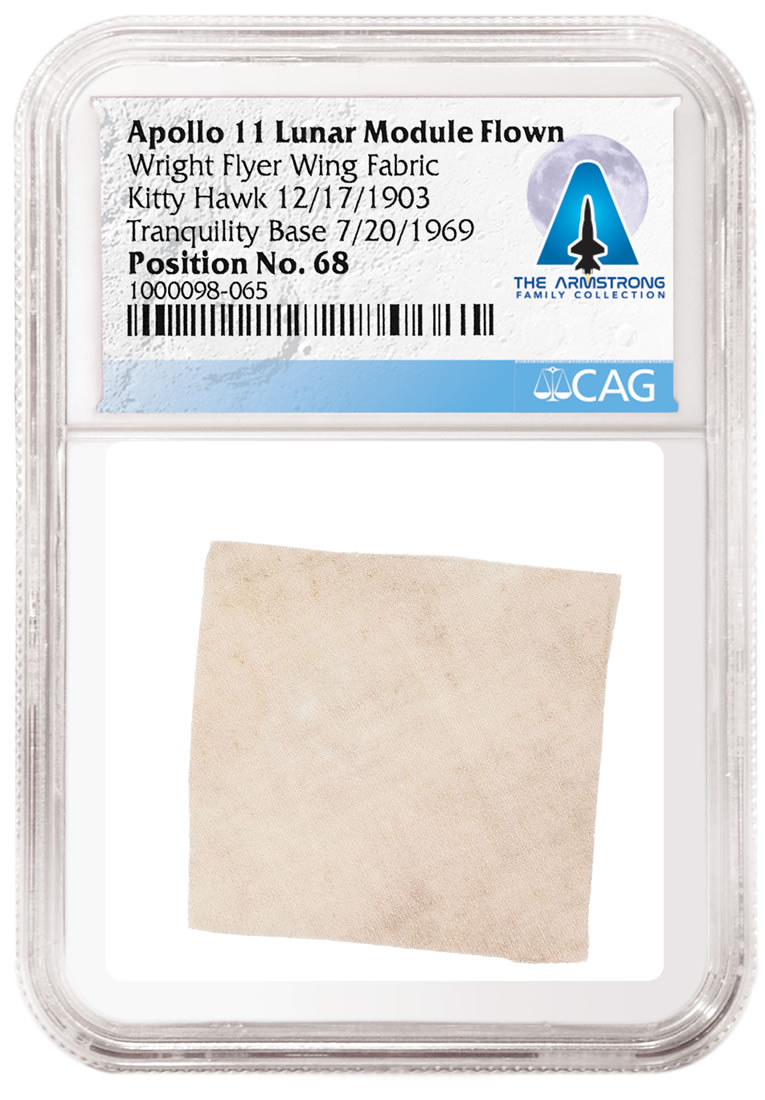 The CAG certification label notes these pieces were present at both Kitty Hawk, North Carolina, at the beginning of the era of manned powered flight, and at the first manned moon landing 65 1/2 years later.