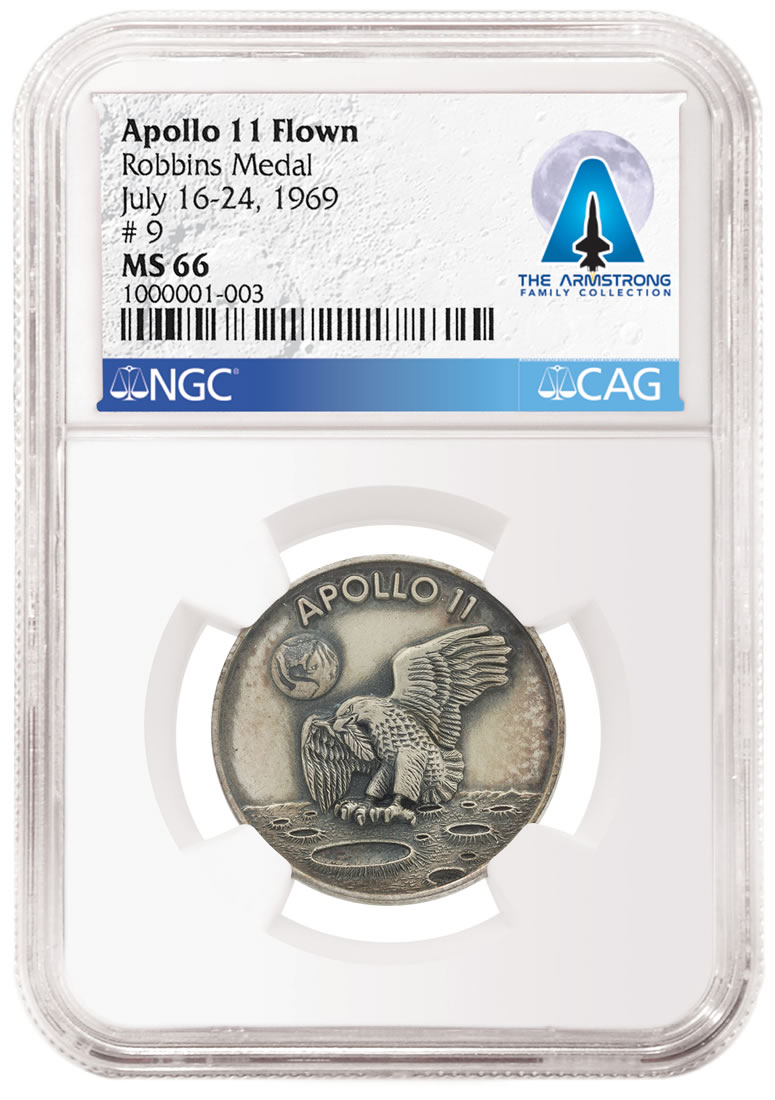 In addition to the three gold Robbins Medals, the Apollo 11 mission also carried 440 silver Robbins Medals. These were individually numbered, and one with a single-digit serial number (9) is also being offered in this sale. It is graded NGC MS 66 and certified by CAG as part of the Armstrong Family Collection.