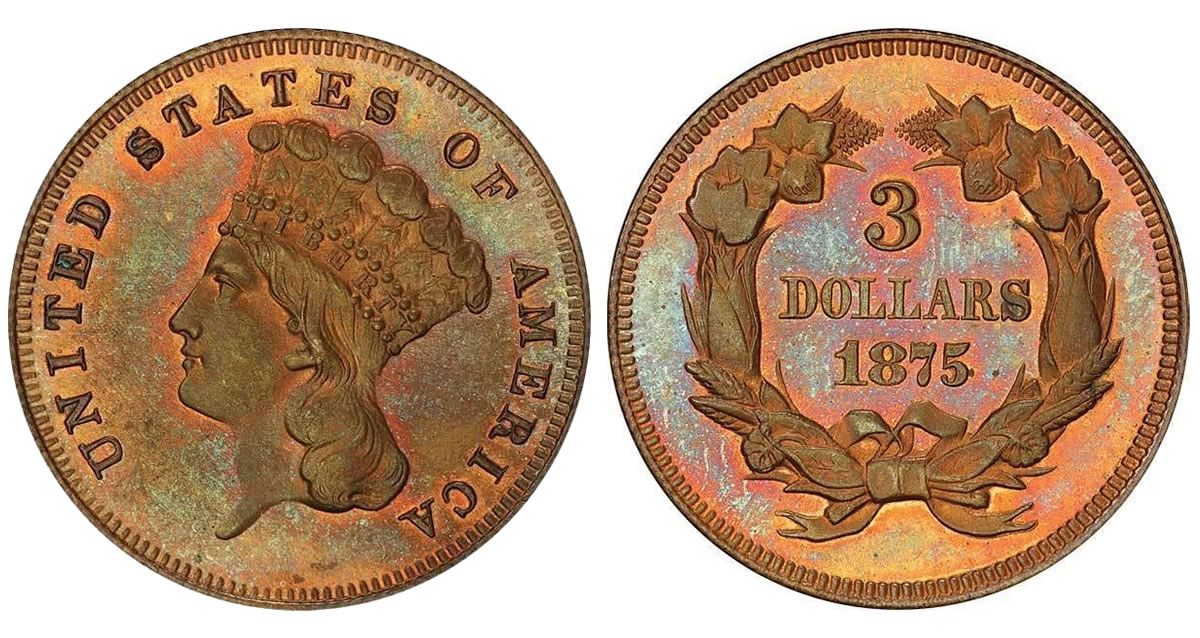 - Lot 514. $3 1875 J-1436. PCGS PR65 RB CAC. Realized $73,438