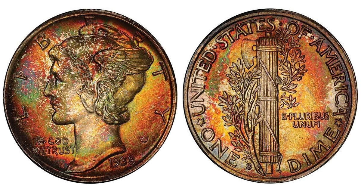 The top selling lots were a pair of Top Pop Mercury Dimes, which three very advanced collectors drove to shocking world record prices: lot 211, a 1931-S in PCGS MS67+ FB CAC realizing $270,250 and lot 220, a monster toned 1938-S PCGS MS68+ FB CAC sold for $364,250.