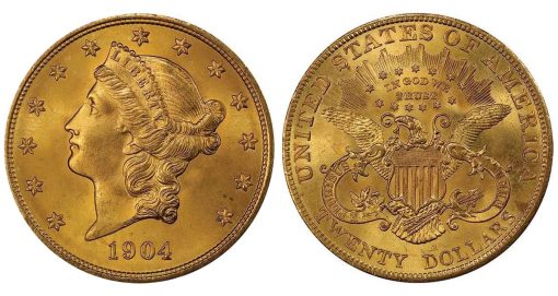 - Lot 482. $20 1904 PCGS MS67. Realized $73,438