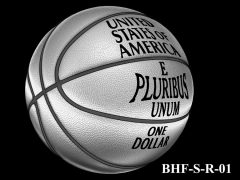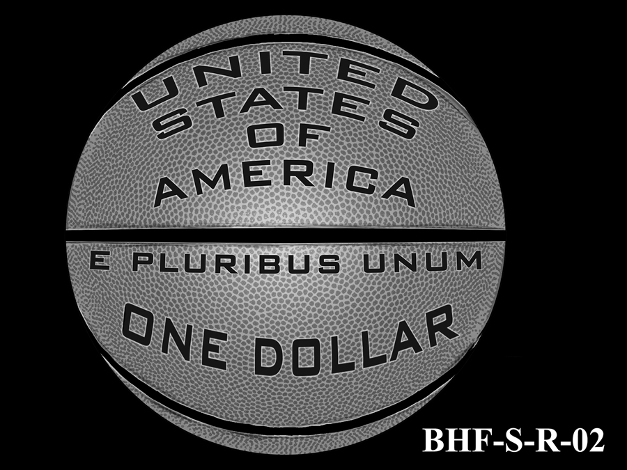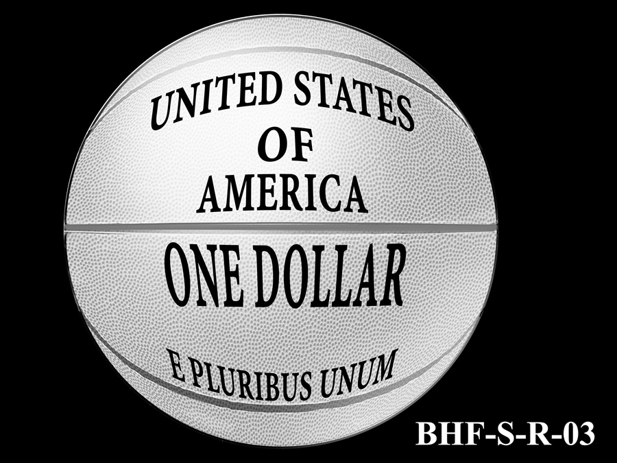Shown are candidate designs for the reverse of the 2020 Basketball Hall of Fame Silver Dollar. The $5 and 50c candidate reverses share the same depictions of a basketball but they bear inscriptions of "FIVE DOLLARS" or "HALF DOLLAR" instead of "ONE DOLLAR."