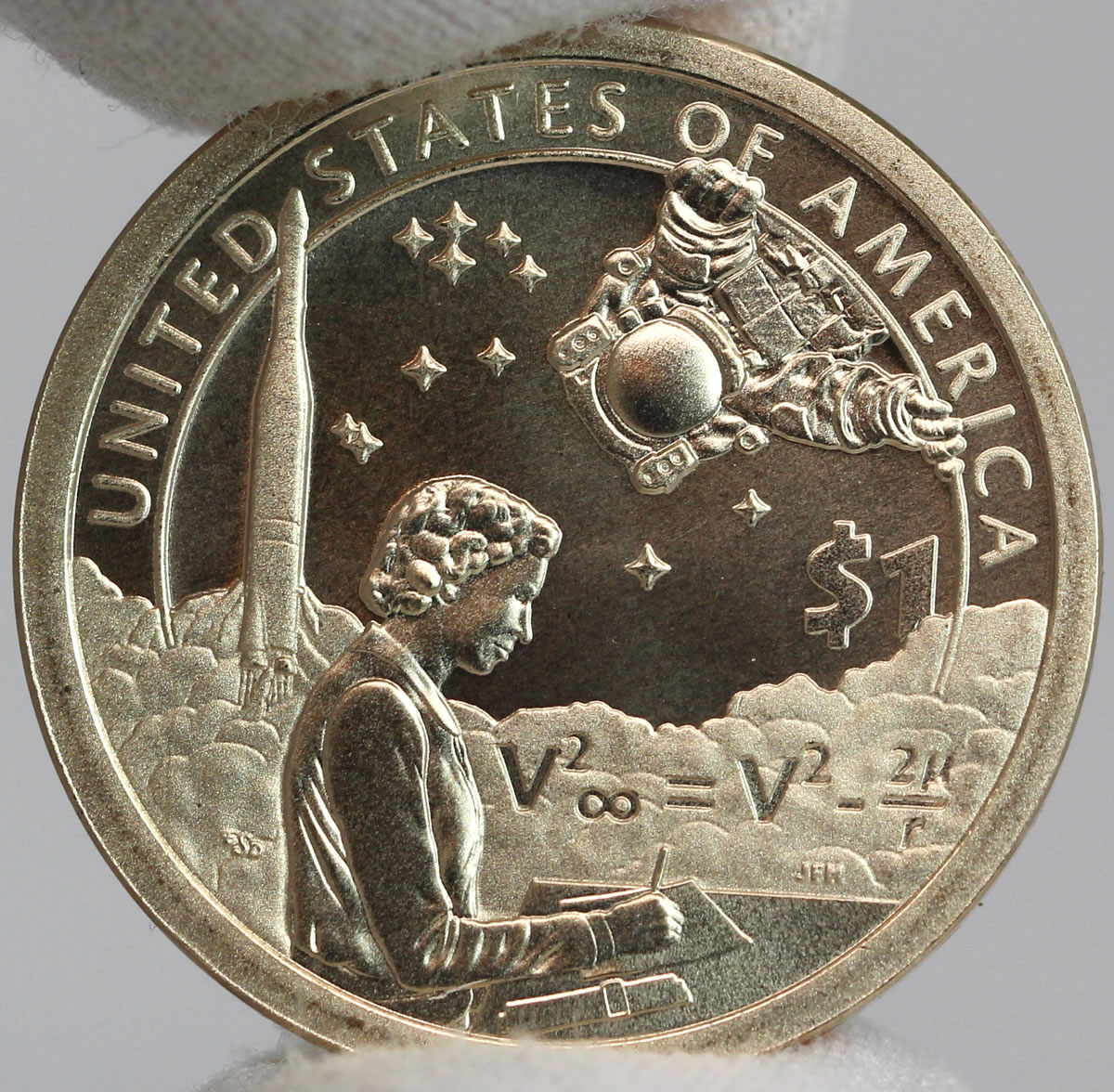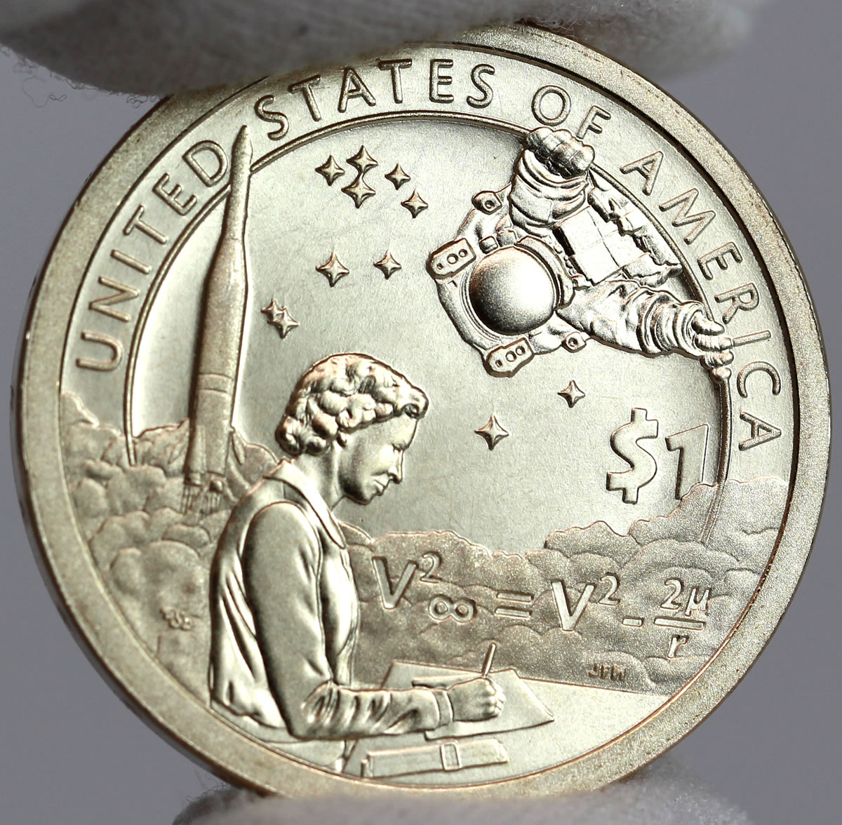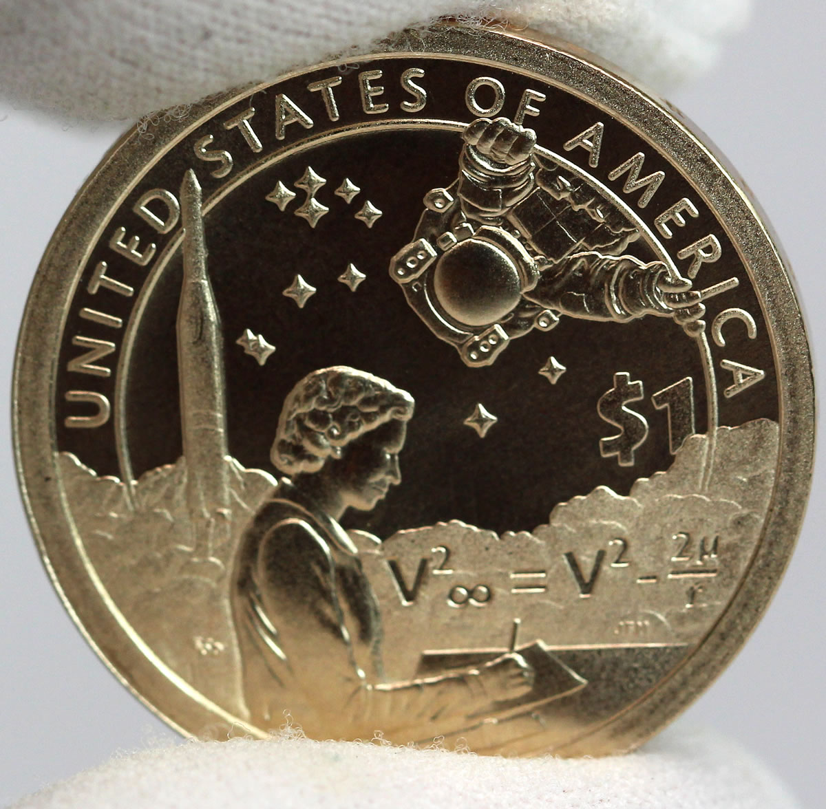 Native American $1 Coins feature annually changing reverses. This year’s reverse highlights the contributions of Native Americans to the U.S. Space Program, depicting engineer Mary Golda Ross working on aerospace calculations with an Atlas-Agena rocket in the background and an astronaut spacewalking above. Emily Damstra created the design and Joseph Menna sculpted it.