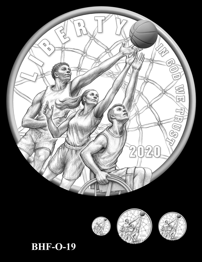 As a part of the process leading up to their release, the Citizens Coinage Advisory Committee (CCAC) and the Commission of Fine Arts (CFA) reviewed dozens of Basketball-themed designs which originated from a public competition that generated 19 obverse candidates and from U.S. Mint artists who created 23 reverse candidates.