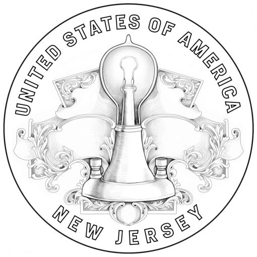The New Jersey $1 Coin honors the development of a light bulb with a filament that could last 1,200 hours. This design features an Edison bulb against an ornate background. The inscriptions are "UNITED STATES OF AMERICA" and "NEW JERSEY."