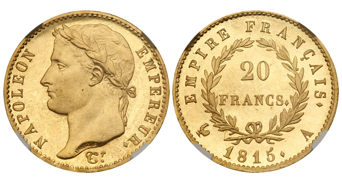 - Napoleon’s 1815 Proof 20 Francs struck during the Hundred Days.