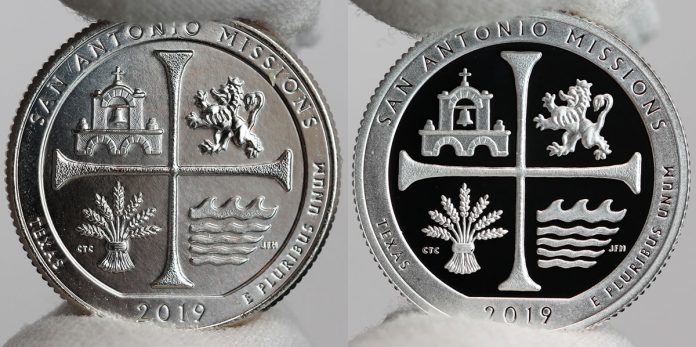 Each coin shares the same reverse design which was created to honor San Antonio Missions National Historical Park of Texas. The coins are in collector-grade finishes with each produced at a different U.S. Mint facility. Regular circulating San Antonio Missions quarters launched on Aug. 26 with bags and rolls of them released on the same day.
