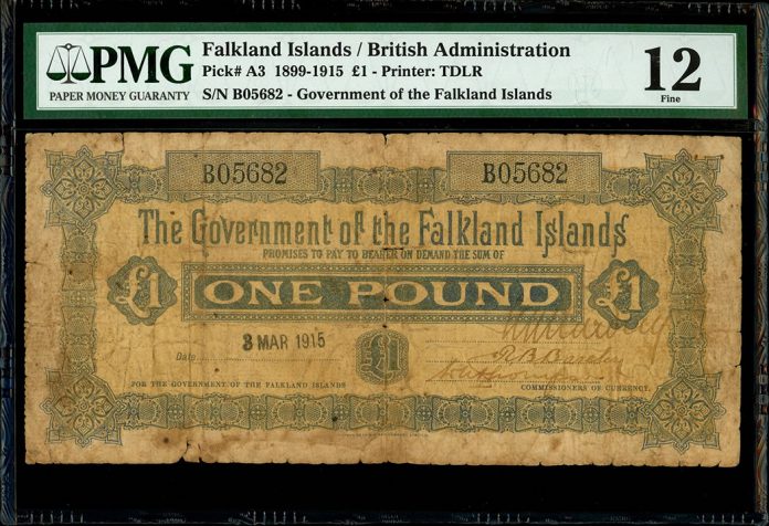 Lot 1312: Falkland Islands, Government of the Falkland Islands, 1 pound, 3-3-1915, serial B05682, PMG Fine 12, rare. Estimate $4,000 and up.