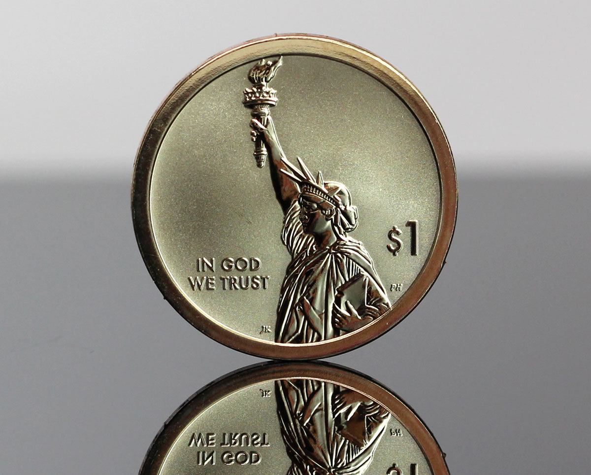 Designed by Justin Kunz and sculpted by Phebe Hemphill, all series coins share a common obverse (heads side) depicting a representation of the Statue of Liberty, a privy mark of a stylized gear, and inscriptions IN GOD WE TRUST and $1.