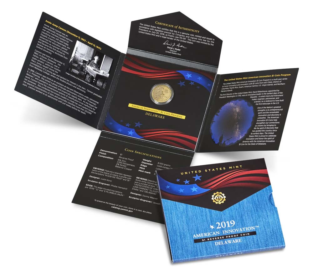 The 2019-S Reverse Proof Delaware $1 Coin is available directly from the U.S. Mint’s online catalog of American Innovation products or by calling 1-800-USA-MINT (872-6468).