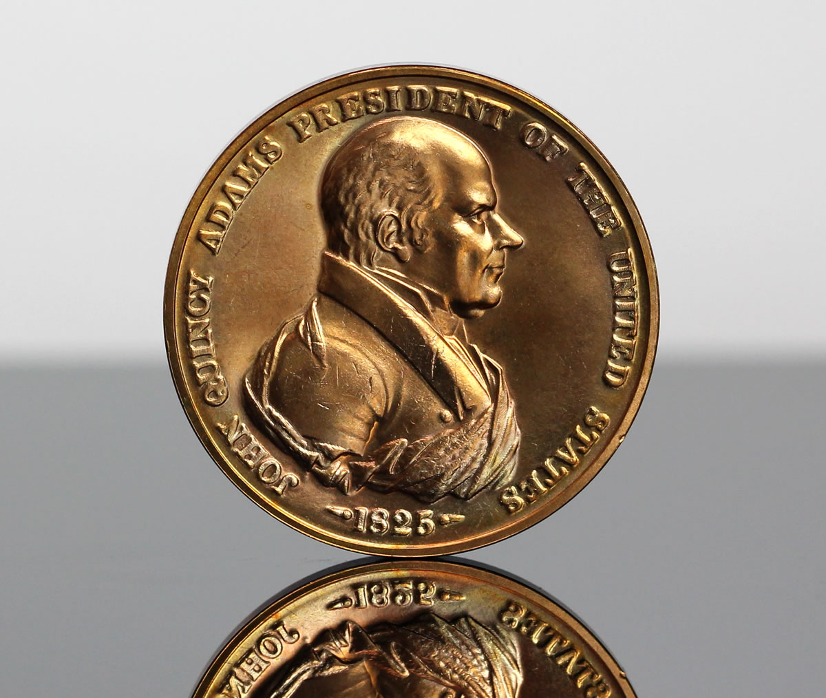 Designed and sculpted by Moritz Furst, this latest medal has an obverse (heads side) portrait of Adams. Inscriptions around the portrait read: "JOHN QUINCY ADAMS," "PRESIDENT OF THE UNITED STATES" and "1825"
