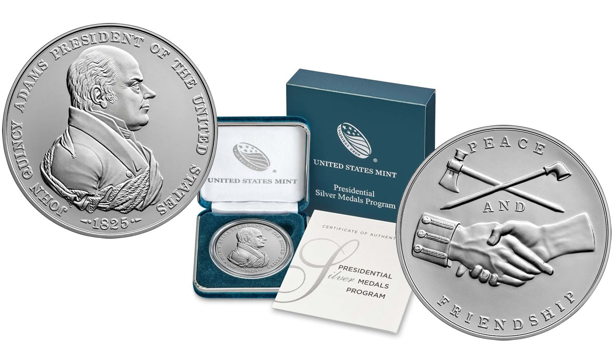 Purchase John Quincy Adams Silver Medals directly from the Mint’s online section of silver medals, found here, or calling 1-800-USA-MINT (872-6468).
