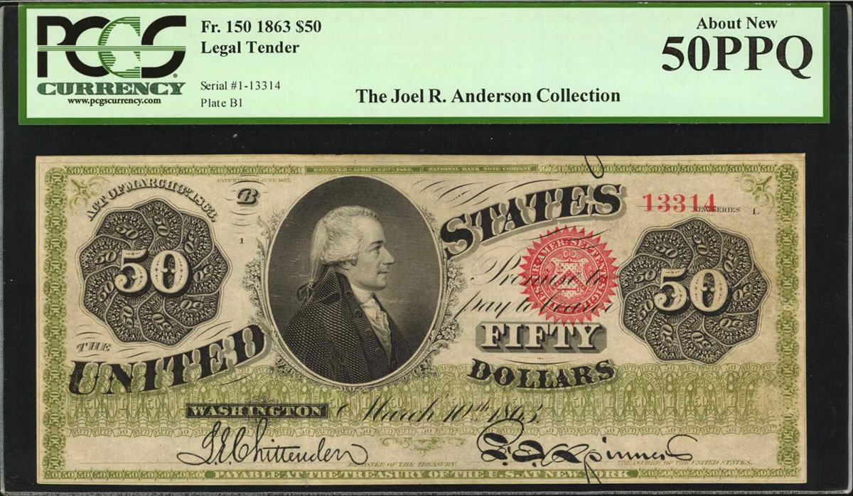 Also pedigreed to the Anderson Collection, lot 10176, a Fr.150 1863 $50 Legal Tender Note graded About New 50 PPQ by PCGS Currency, sold for $192,000.
