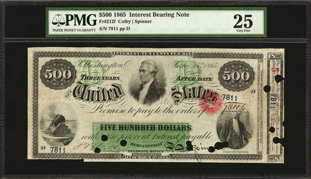 Lot 10177, a Fr.212f 1865 $500 Interest Bearing Note graded Very Fine 25 by PMG brought the highest price of the auction. Formerly from the Joel R. Anderson Collection, it realized $264,000.