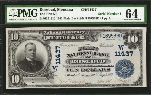 A previously unreported serial number 1 $10 1902 Plain Back from the First National Bank of Rosebud, Montana graded Choice Uncirculated 64 by PMG was the top selling National Currency note of the auction realizing $48,000 (lot 10361).