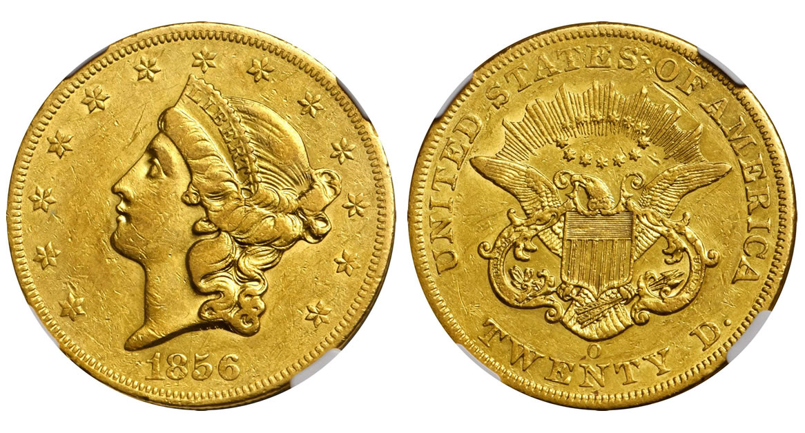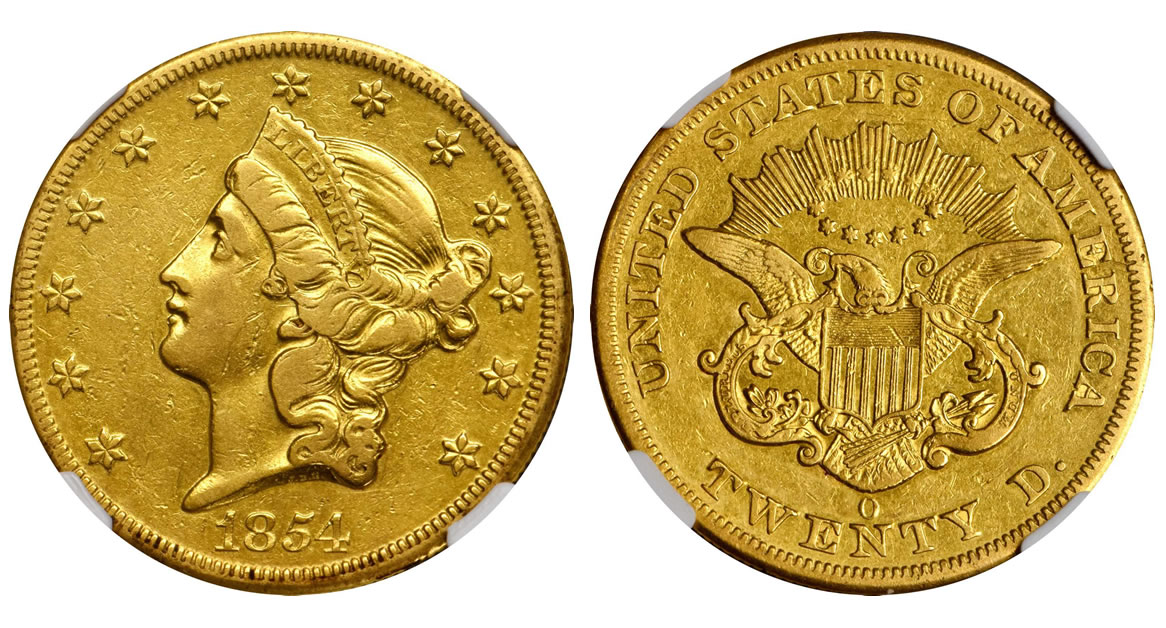 Claiming the top spots of the session were a pair of New Orleans double eagles: an EF-45 (NGC) 1854-O that sold for $240,000 in lot 3187, and an AU-53 (NGC) 1856-O in lot 3188 that brought $264,000.