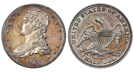 Numerous rare die marriages attracted the most advanced specialists, while type collectors enjoyed rare Red Book types across the Flowing Hair, Draped Bust, Capped Bust, Reeded Edge, and Liberty Seated series. The star of the collection was the 1838-O half dollar graded Specimen-63 (PCGS). One of just nine known examples, it earned $504,000 in lot 7197. A near-Mint 1796 O-101 16 Stars half dollar in lot 7040 also caused significant excitement, eventually selling for $228,000 in an AU-58+ (PCGS) holder.