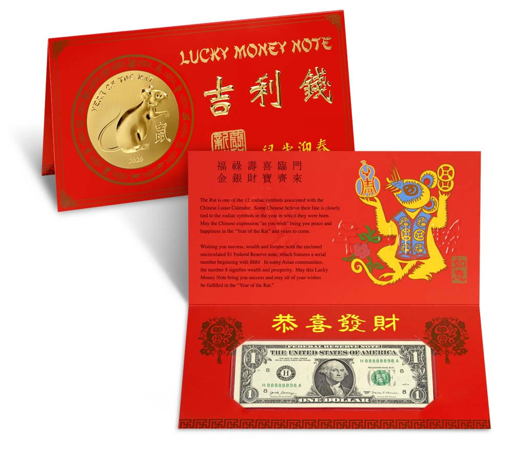 Featuring an uncirculated $1 Federal Reserve note with a serial number beginning with "8888," the BEP’s "1$ Year of the Rat" product was released today for $5.95.