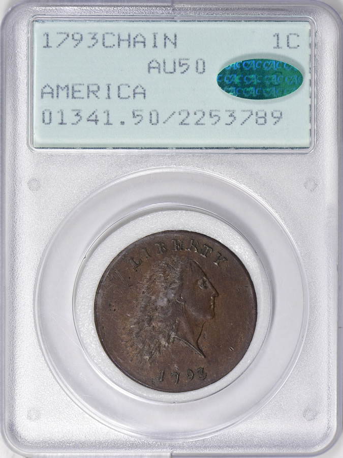 1793 Chain Cent AMERICA PCGS AU-50 BN CAC OGH (1st Gen) — Sold for $171,565
