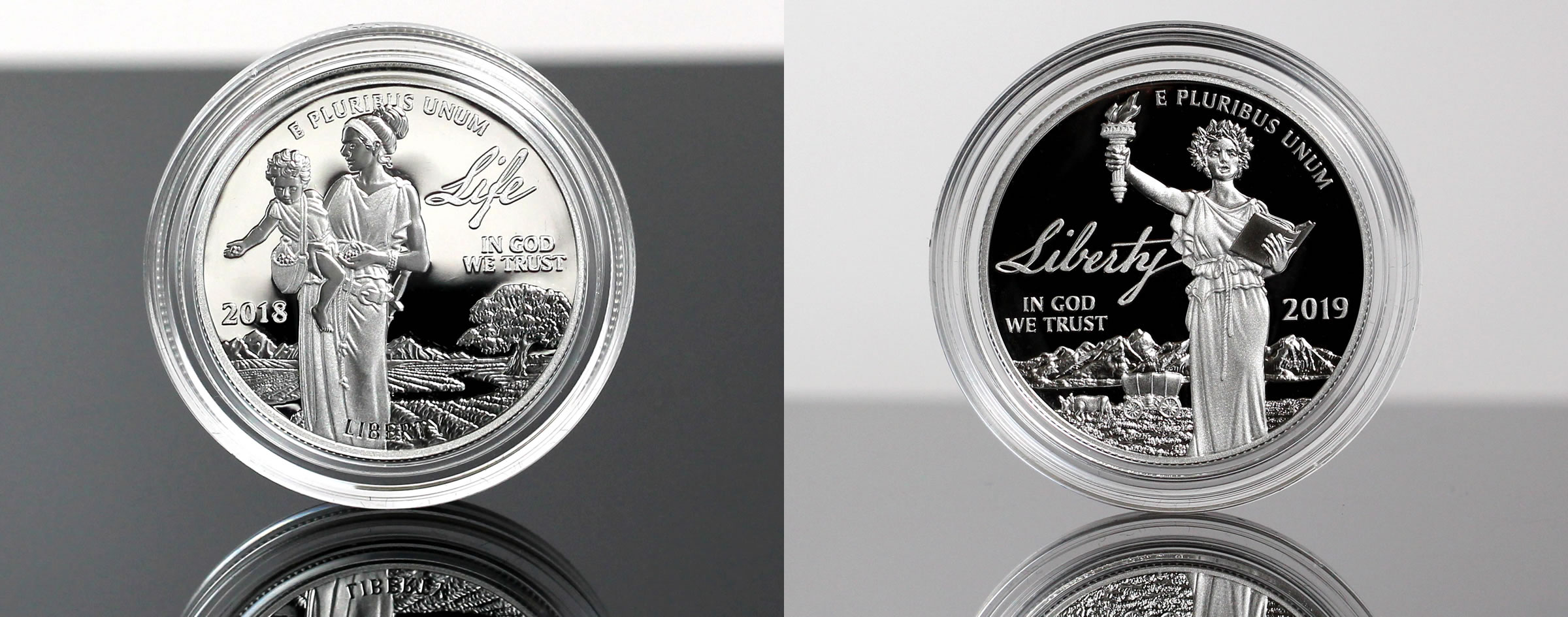 Struck in 1-ounce .9995 platinum, coins in the themed program feature unique obverse (head side) designs that are paired with a common reverse (tails side) design. Obverses celebrate the three tenets in the Preamble to the Declaration of Independence — Life, Liberty and Happiness.