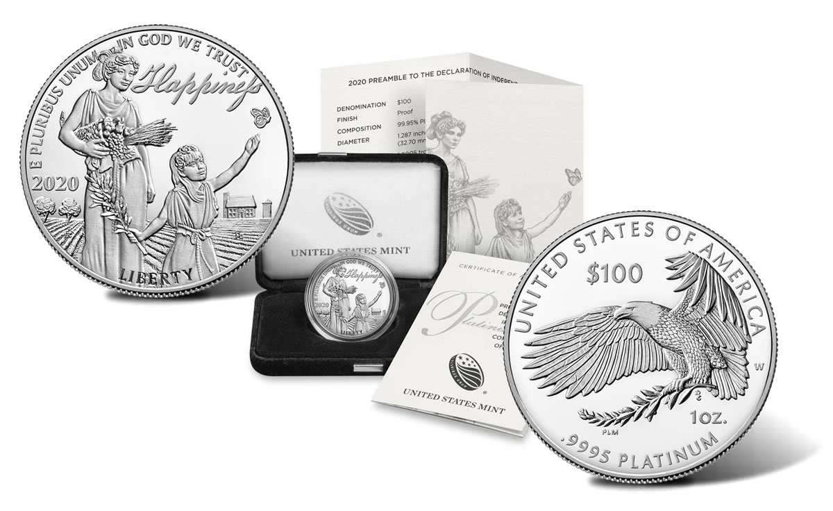 Today, Jan. 30, the United States Mint started accepting orders for its 2020-W Proof American Platinum Eagle — Pursuit of Happiness coin, the final of three issues from the Preamble to the Declaration of Independence design series.