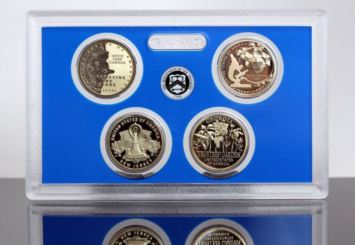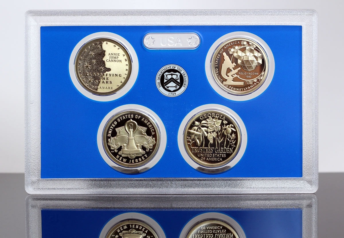 The dollar honors Trustees’ Garden of Georgia, and features a reverse proof finish which is notable for having mirror-like design elements and frosted backgrounds — opposite of standard proof coins. It follows earlier and still available Georgia dollars with an uncirculated version sold in rolls and bags and a proof version sold in a four-coin proof set. A photo of one of those proof sets follows.