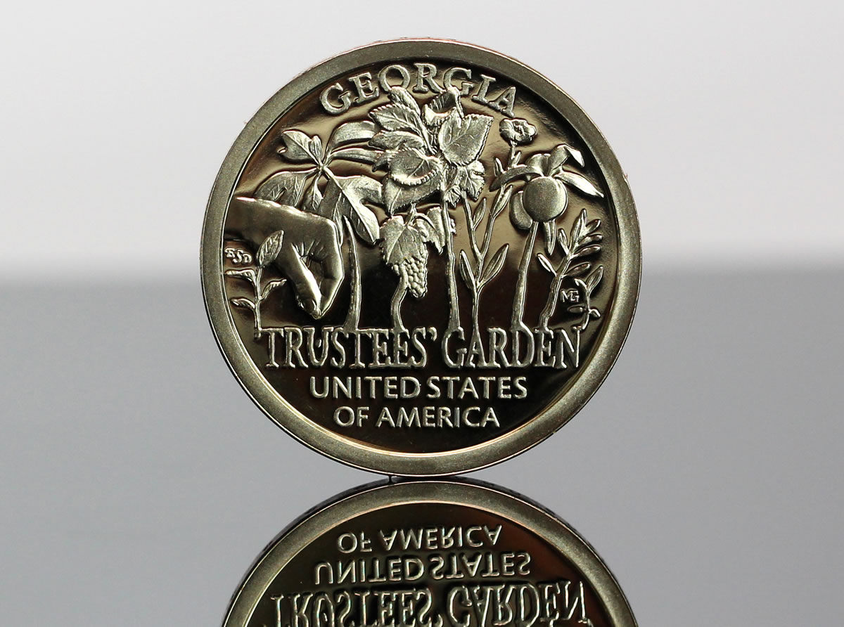 A hand planting seeds is found on the coin’s design along with an orange tree seedling, sassafras, grapes, white mulberry, flax, peaches, olive, and a young shoot too small to be identified. Inscriptions read TRUSTEES’ GARDEN, UNITED STATES OF AMERICA and GEORGIA. Emily Damstra created the design and Michael Gaudioso sculpted it.