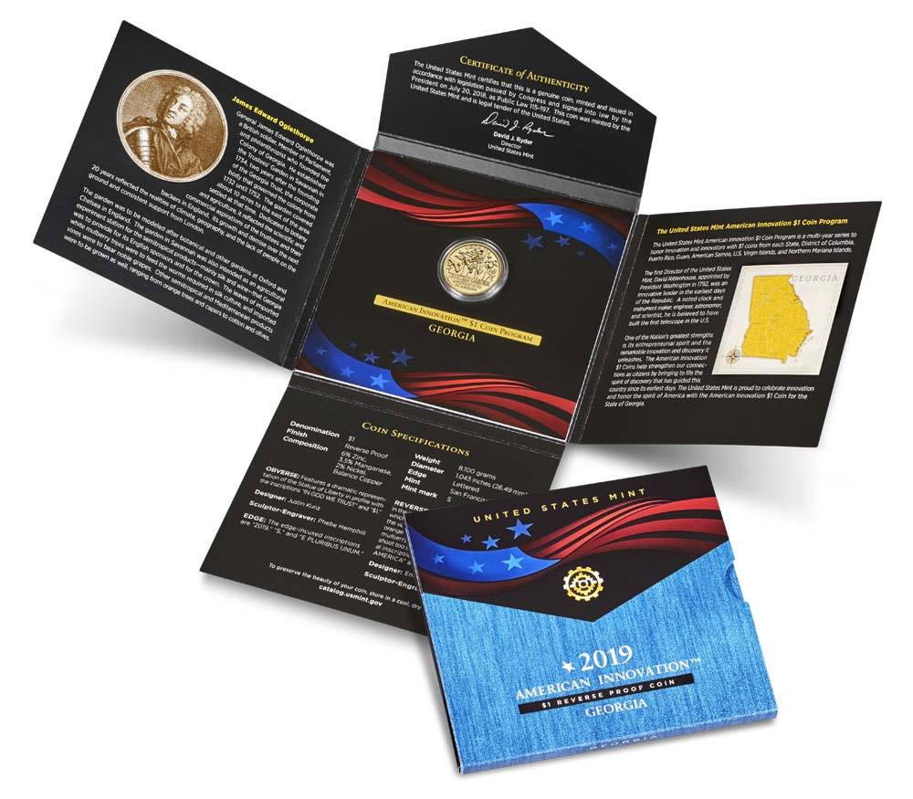 The 2019-S Reverse Proof Georgia $1 Coin is available directly from the U.S. Mint for $11.95. Place orders by visiting the Mint’s website page dedicated to American Innovation products or by calling 1-800-USA-MINT (872-6468).