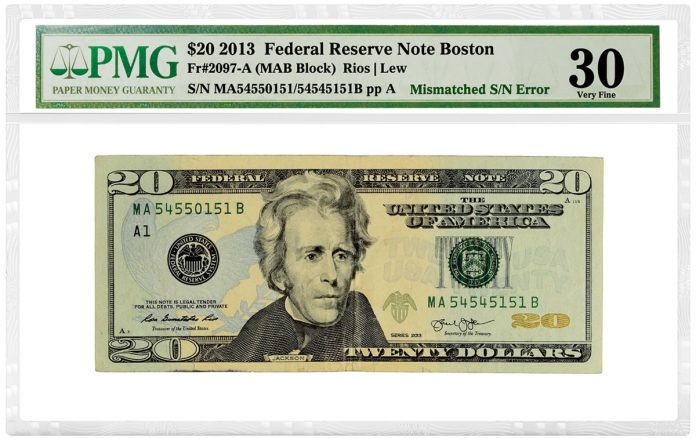 She immediately submitted the note to Paper Money Guaranty® (PMGnotes.com), which confirmed that the 2013 $20 Federal Reserve Note (Boston) had an authentic — and quite rare — mismatched serial number error.