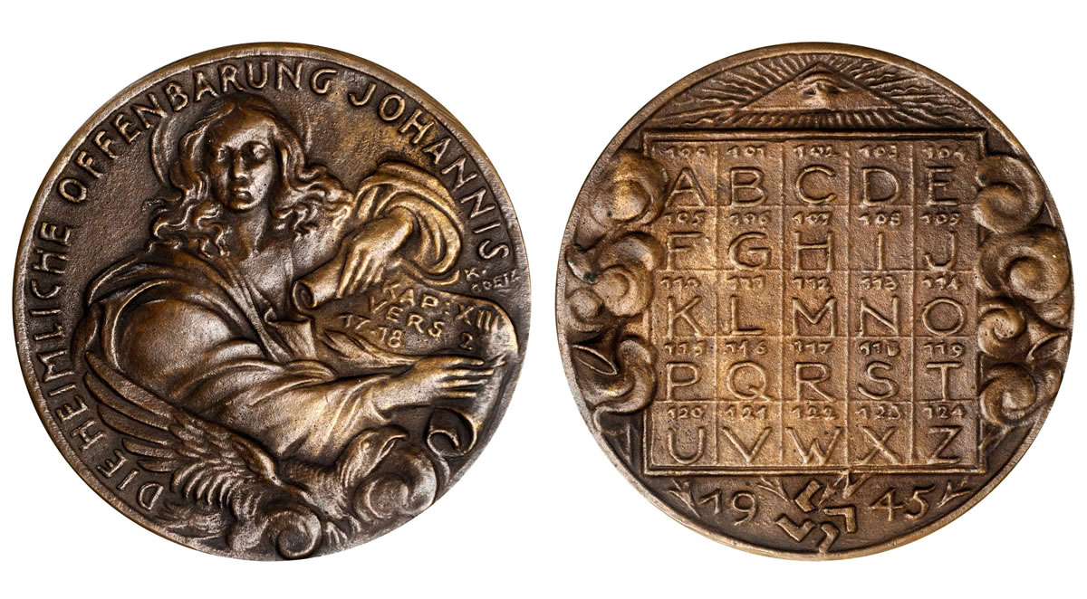 One of the more unusual and moving medals, however, is from late in Goetz’s series. The "Revelations of John the Evangelist" alludes to a passage in the Book of Revelations, whereby the anti-Christ can be seen through the number 666. On the reverse of the medal, Goetz presents an alphabet table, assigning a number to each letter. It can’t be lost upon anyone that this medal, dating to 1945, achieves the "number of the beast" when adding those assigned to the letters which spell ‘Hitler,’ an obvious play by Goetz to portray contemporary sentiments toward the end of World War II.