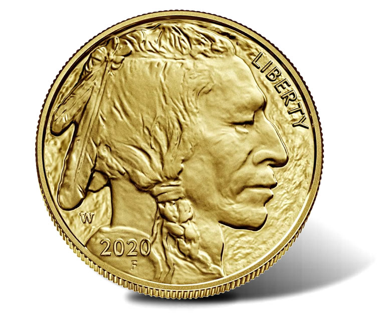The gold coin’s obverse showcases a right-facing portrait of a Native American. The image by James Earle Fraser is said to be created from a composite of three different individuals. Inscriptions around the design include ‘LIBERTY’, a ‘W’ mint mark to denote its production at the West Point Mint, ‘2020’, and an ‘F’ for the artist’s initial.