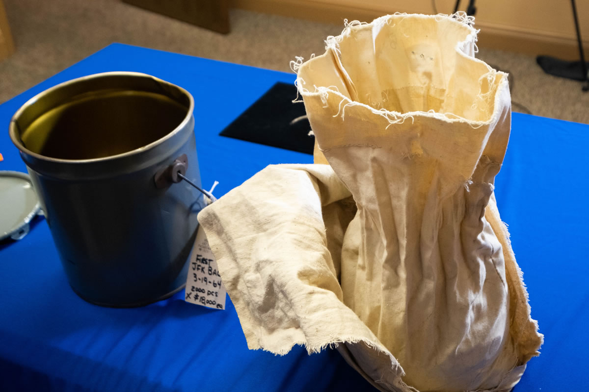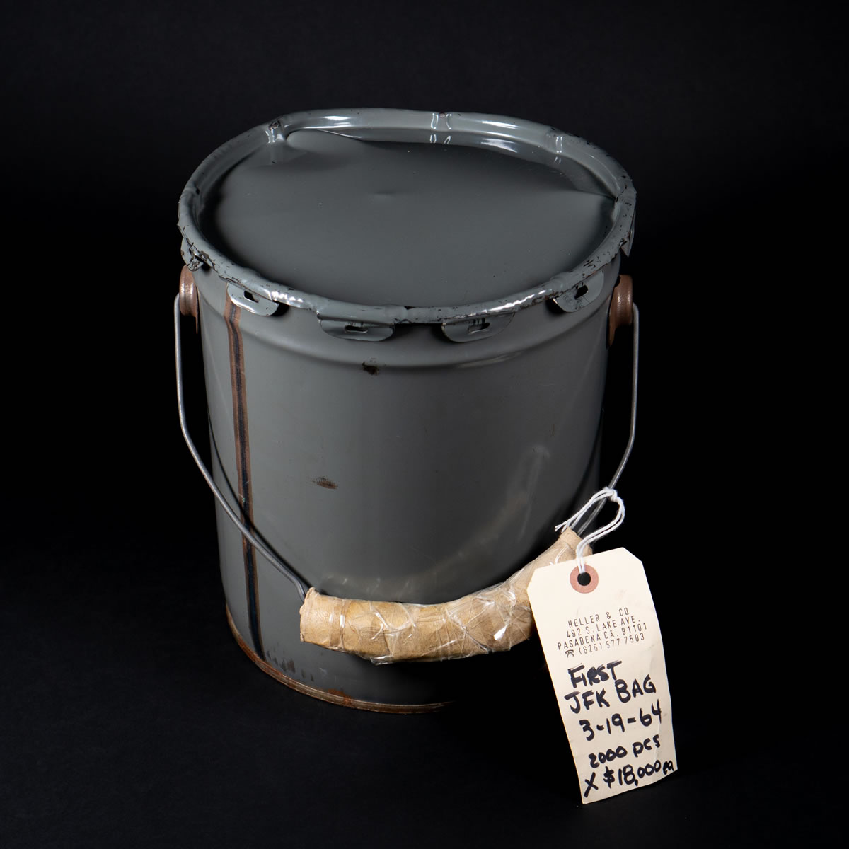 NGC received the bag of 1964-D Kennedy Half Dollars from RCTV still sealed inside a metal bucket. Salzberg, who has previously examined several sealed bags of 1964 coins, opened the bucket to find a light tan canvas bag stamped with "American Trust Company."