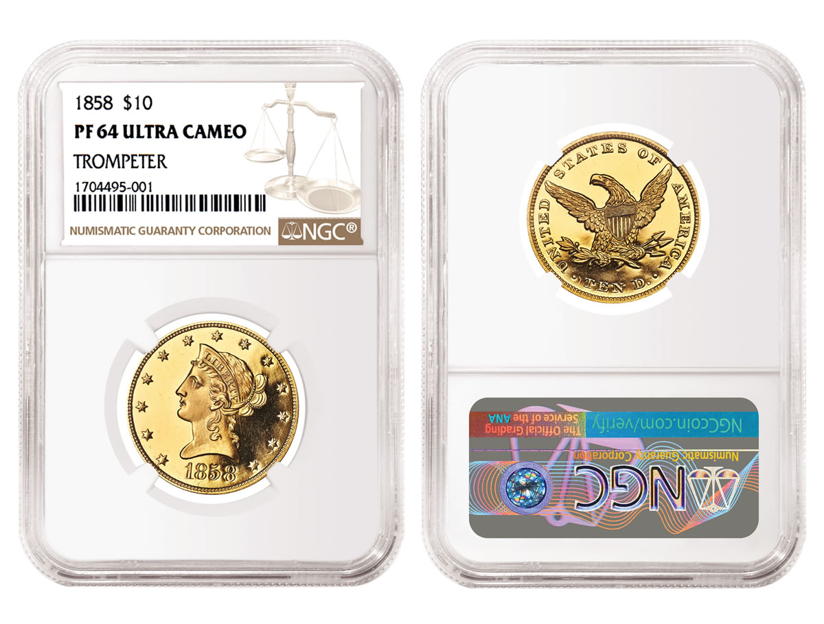 The top four prices realized in the US coins sale were for NGC-certified coins. The 1858 Eagle, which is graded NGC PF 64 Ultra Cameo and pedigreed to the Trompeter Collection, realized $480,000. It is the only known example in private hands and hails from the year the US Mint first announced that it was selling Proof coinage; previously, it had been a poorly kept secret.