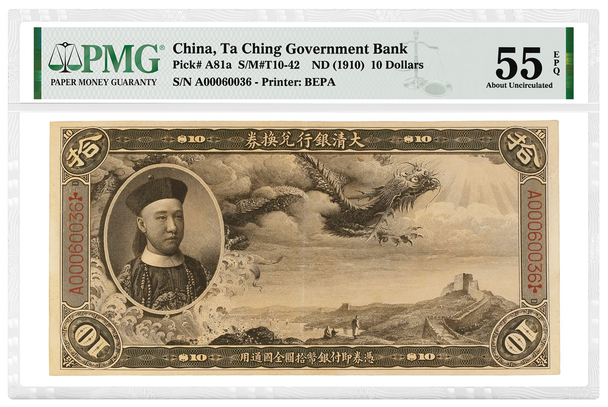 The top note in the world paper money sale was an extremely rare China (1910) Ta-Ching Government Bank 10 Dollars graded PMG 55 About Uncirculated EPQ that realized $60,000 — more than doubling its pre-auction estimated sales price. The PMG Population Report lists this note as the finest of the two examples certified by PMG.