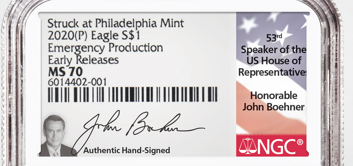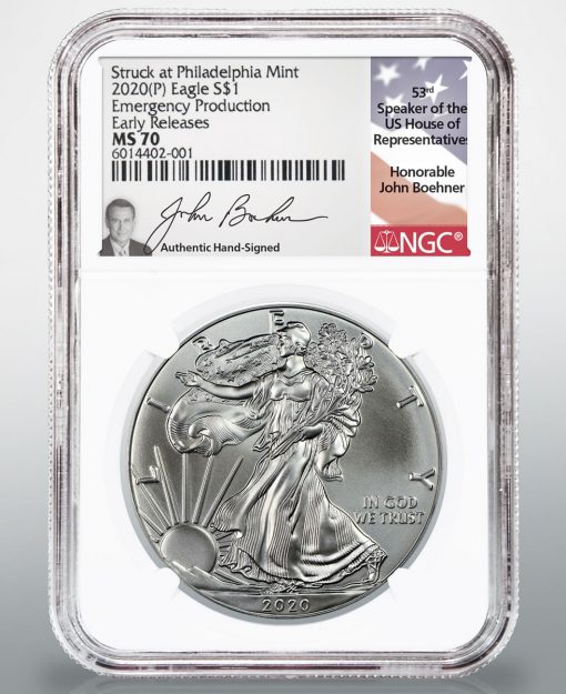 A former Speaker of the U.S. House of Representatives, the honorable John Boehner of Ohio, has personally signed inserts on a limited number of the scarce 2020 silver American Eagles struck during the recent emergency production at the United States Mint facility in Philadelphia.