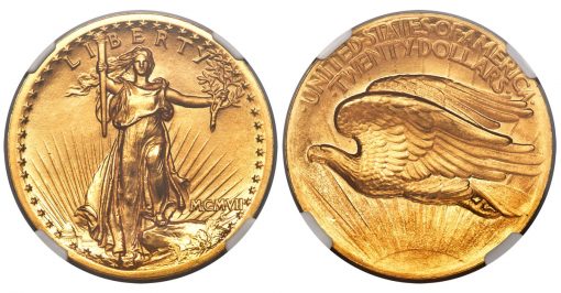 An example of the 1907 twenty dollar High Relief, PR67+ NGC, retained exceptional surface preservation, leading to its $168,000 high bid. As expected, each side displays a pronounced satin-like texture and the strike is full. The bright yellow-gold surfaces show a slight tinge of reddish patina, leaving an outstanding proof High Relief and one of the finest Heritage has ever brought to auction.