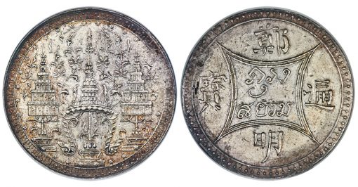 Jacob’s stunning collection includes such rarities as an exquisite 1864 Thai "Birthday" Tamlung, AU55 NGC. A classic rarity of the Thai series, was struck to commemorate Rama IV’s 60th birthday. While the obverse of the type displays the familiar crown motif commonplace in Thai coinage of the era, the reverse exhibits a more unique design, with the central inscription "Kingdom of Siam," surrounded by the Chinese inscription "Cheng Ming Tung Pao" ("Negotiable Currency of Cheng Ming").