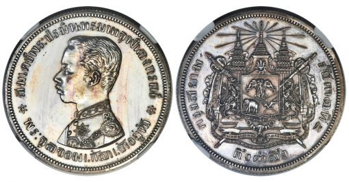 - A 1909 Rama V silver Essai 1/2 Baht (2 Salung) RS 128, MS64 NGC, was minted in Paris. It is widely considered a classic rarity of the machine-made Thai series, virtually unattainable in any condition, and perhaps even rarer than the Essai 1/4 Baht and Baht of the same set. The history behind the coin is as fascinating as the piece itself. Originally ordered by Rama V during his visit to Europe as denominations intended for circulation, the coins did not reach Thailand from the Paris mint until after Rama V’s early death — with the Baht, the only coin with any of its mintage released, largely melted down. Representing the last issue of the monarch as such, the coin at hand displays a delightful mottled toning and notable device frost. Ex. Jacobs Collection.