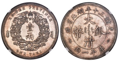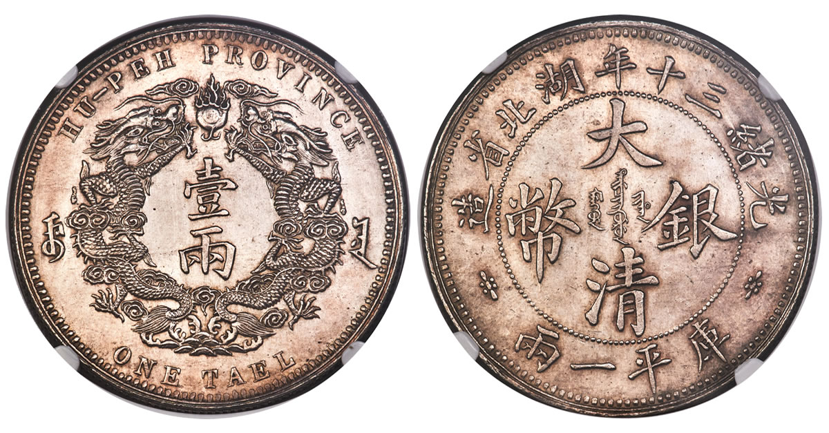 A 1904 Kuang-hsü "Large Characters" Tael Year 30, MS63 NGC, on offer ranks among the finest seen. Its sublimely mint "fresh" fields, studded with light die polish lines and flanking designs rendered to exact calculation, reveals a degree of visual appeal and charm that places it into an elite tier, currently exceeded by only a single example seen by PCGS and two by NGC.