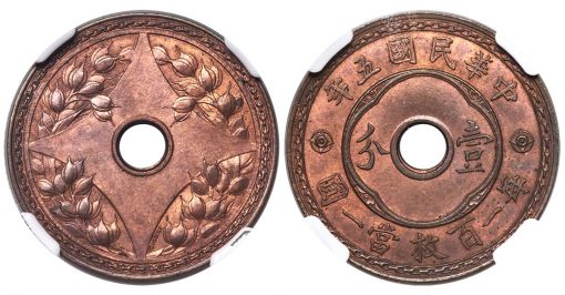 Other top Chinese lots include an extraordinary 1916 Republic Bronze L. Giorgi Cent Pattern, MS63 Red and Brown NGC. It is among the rarest copper patterns of the early Republican series — entirely missing Jacobs collection. Produced by the Tientsin mint’s chief engraver, Luigi Giorgi, most famously known for his iconic pattern dollar series of President Yuan Shih-kai, this issue represents the officially adopted design, with the addition of the artist’s signature just to the right of 6 o’clock on the reverse, as holdered. One of just 10 reportedly certified between NGC and PCGS combined, it is only the fourth we have been able to locate coming to auction in the past two decades.