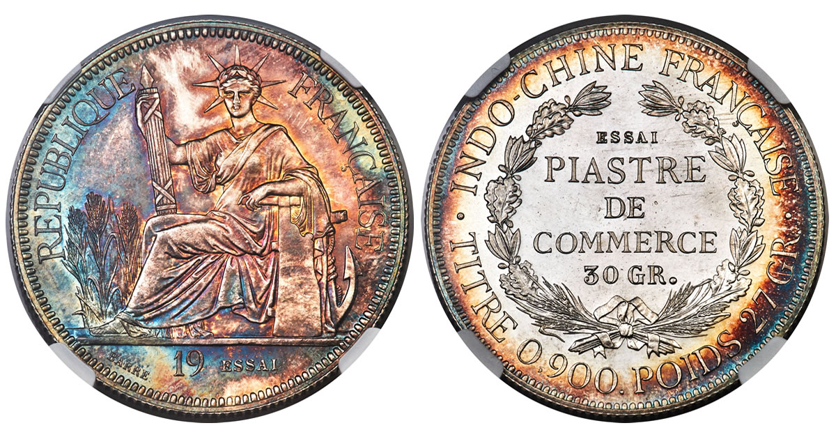 The finest known French Indo-China Pattern Piastre in a virtually immaculate rendition of this extremely rare and highly sought-after pattern, rises above the field. Experts submit the coin could have been produced for the six-month-long Colonial Exposition (Exposition coloniale internationale) in Paris in 1931. The example on offer is almost certainly representing the finest known.