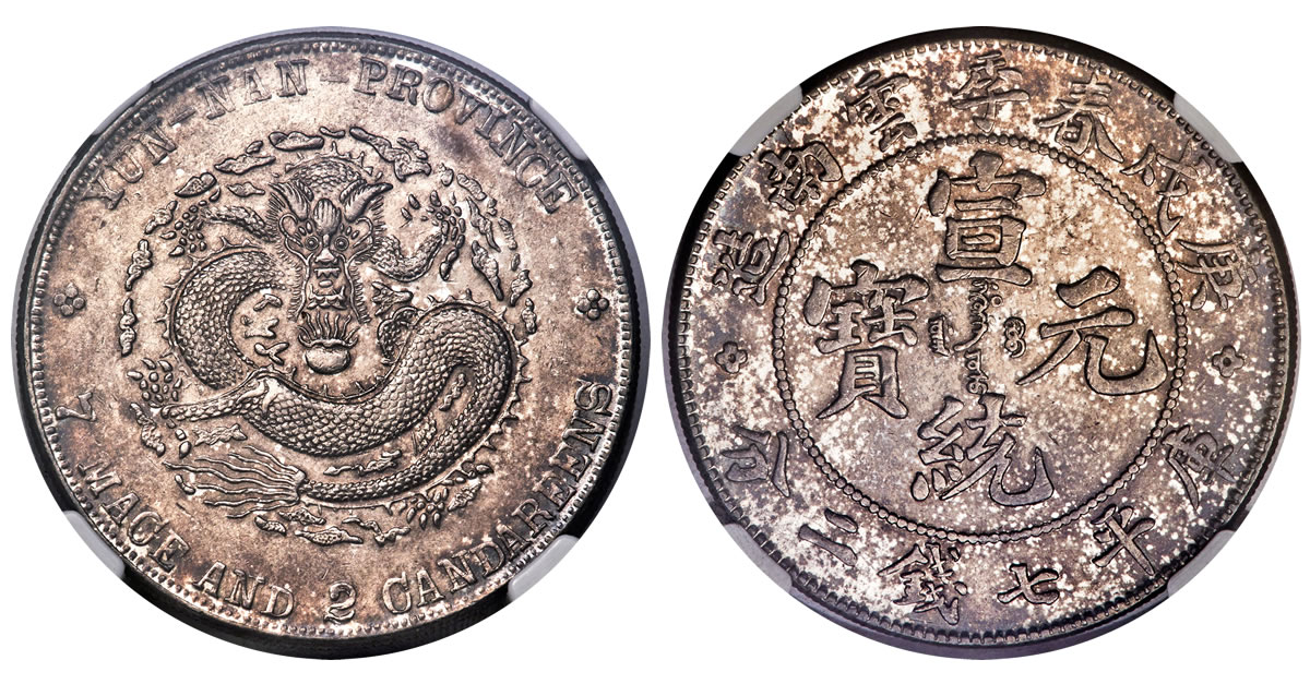 The singular highlight of this auction, the Hsüan-t’ung Yunan "Spring" Dollar CD 1910, AU58 NGC, is so called in reference to the four Chinese characters that translate to "Spring 1910" on its reverse. It returns to auction for the first time in nearly a decade after selling for nearly $550,000 in 2011. The coin is considered one of China’s rarest coins and it has been wrapped in mystery and legend since its discovery in 1920. No one knows why the coin was minted to mark the spring of 1910.