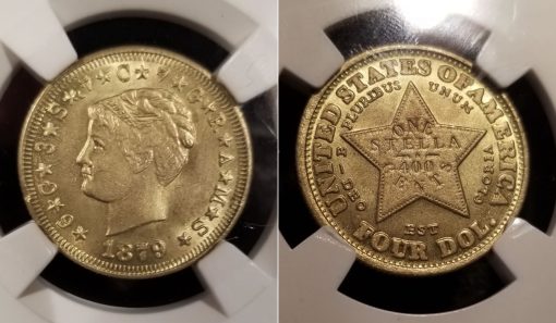 The bogus Stella was housed in a counterfeit Numismatic Guaranty Corporation holder with a fake insert label printed with the same NGC PR63 grade and certification number as the genuine coin.