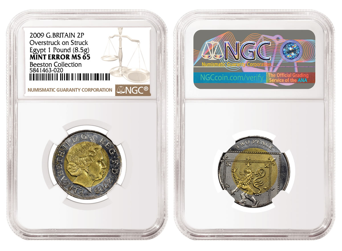In rare instances, a coin is overstruck with dies used to strike the coins of a different country. This is the case with a Great Britain 2009 Two Pence in the Beeston Collection that was overstruck on an Egyptian One Pound. It is graded NGC Mint Error MS 65.