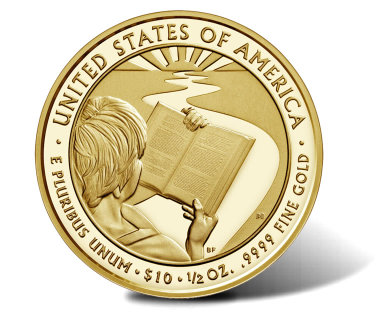 Inscribed around the reverse design are "UNITED STATES OF AMERICA," "E PLURIBUS UNUM," "$10" "1/2 oz.," and ".9999 FINE GOLD."