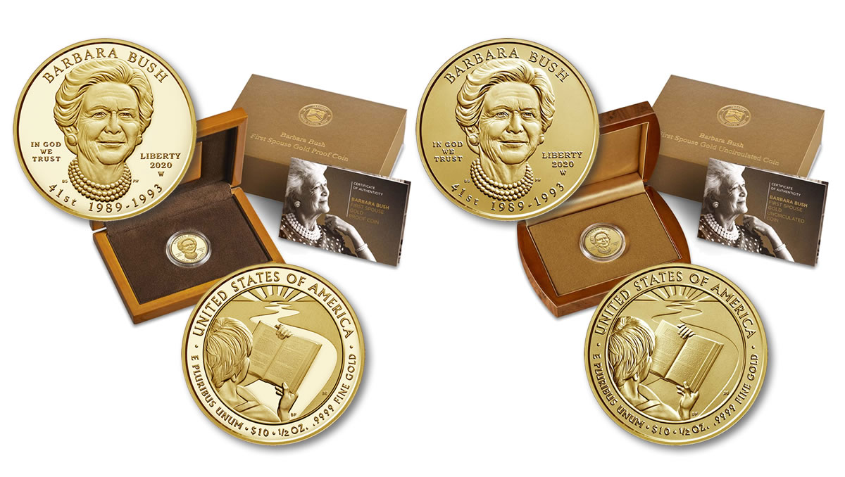 Today, Aug. 20, the United States Mint released 2020-W $10 Barbara Bush First Spouse Gold Coins in collector qualities of proof and uncirculated.